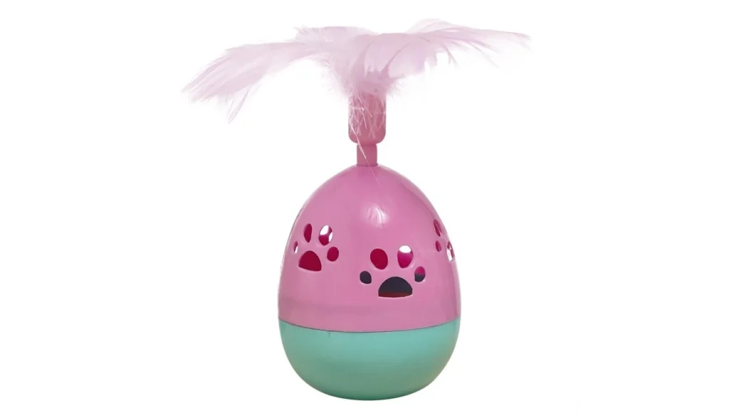 ของเล่นแมวรูปทรงไข่อันนี้จะเป็นแบบล้มลุก หรือก็คือตัวของเล่นจะสามารถลุกขึ้นมาตั้งตรงได้ แม้จะโดนผลักให้ล้มนั่นเอง ซึ่งมันจะทำให้ของเล่นดูมีความอยู่ไม่นิ่งและกระตุ้นความสนใจของน้องแมวได้เป็นอย่างดี ข้างในของตัวไข่ล้มลุกจะมีกระดิ่ง และส่วนหัวของไข่จะมีขนไก่ติดอยู่ ซึ่งนั่นเป็นตัวทำให้น้องแมวรู้สึกสงสัยและอยากตะปบเล่นได้ดี ดังนั้น มันน่าจะเหมาะกับท่านที่ไม่ค่อยมีเวลาอยู่บ้าน แล้วอยากหาของเล่นสักชิ้นที่เจ้าเหมียวสามารถเล่นสนุกได้ด้วยตัวเอง