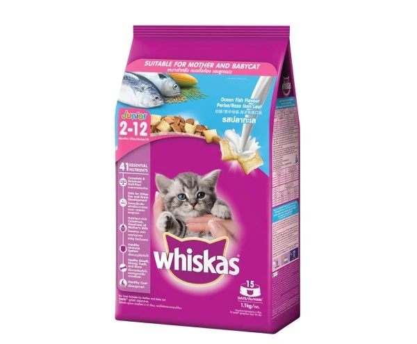 Whiskas สูตรลูกแมวอายุ 2-12 เดือนอันนี้จะมีสองรสชาติให้คุณเลือก นั่นคือรสปลาทูและปลาทะเล ซึ่งปริมาณของมันจะมีความคุ้มค่าเมื่อเทียบกับราคา ส่วนเรื่องคุณประโยชน์ มันจะมีกรดไขมันโอเมก้า 3, 6 และสังกะสีที่ช่วยบำรุงผิวหนังและเส้นขนของน้องให้นุ่มสลวยเงางาม มันจะอุดมไปด้วยวิตามินและแร่ธาตุต่างๆ ในปริมาณที่เพียงพอกับความต้องการของน้อง และมันก็จะมีเม็ดพ็อกเก็ตสอดไส้ครีมที่ช่วยเพิ่มความอร่อยให้กับมื้ออาหารของน้องอีกด้วย