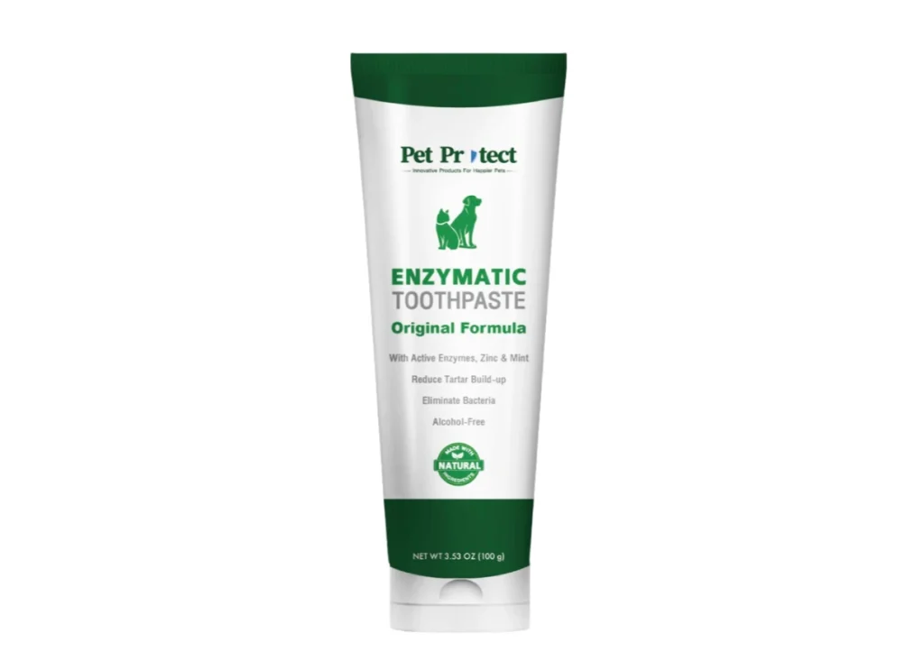แบรนด์ Pet Protect นั้นมีสินค้าที่ช่วยทำความสะอาดช่องปากให้กับสุนัขหลากหลายแบบ รวมถึงยาสีฟันสำหรับสุนัขและแมวด้วย ซึ่งตัวยาสีฟันอันนี้จะมีส่วนผสมของเอนไซม์ที่ช่วยลดแบคทีเรียในช่องปากสุนัข มีส่วนผสมของ Zinc ที่ช่วยให้ฟันแข็งแรง มีคุณสมบัติช่วยลดการอักเสบของเหงือกและดูแลสุขภาพเหงือกให้แข็งแรง ช่วยขจัดคราบพลัคและคราบหินปูน มีกลิ่นหอมมินท์สดชื่นที่ช่วยลดกลิ่นปากได้ดี และเป็นยาสีฟันที่สุนัขสามารถกินเข้าไปได้อย่างปลอดภัยเช่นเดียวกันกับยาสีฟันชนิดอื่นๆ ในนี้